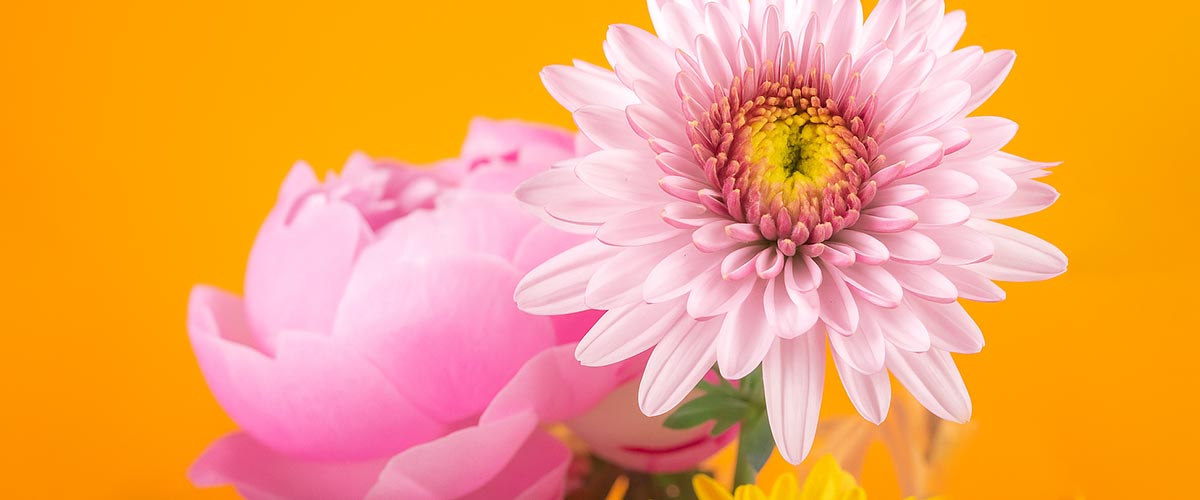 Pink chrysanthemum and pink peony on a bright orange background