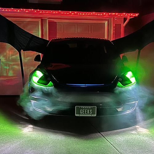 In 2018, we got ourselves a Tesla Model 3 – we're self-proclaimed tech geeks, and our "GEEKS" license plate proves it. Tesla cars are known for their unique features, like the "front trunk" (ie: "frunk"), and we saw a golden opportunity to turn our vehicle into something extraordinary for Halloween.