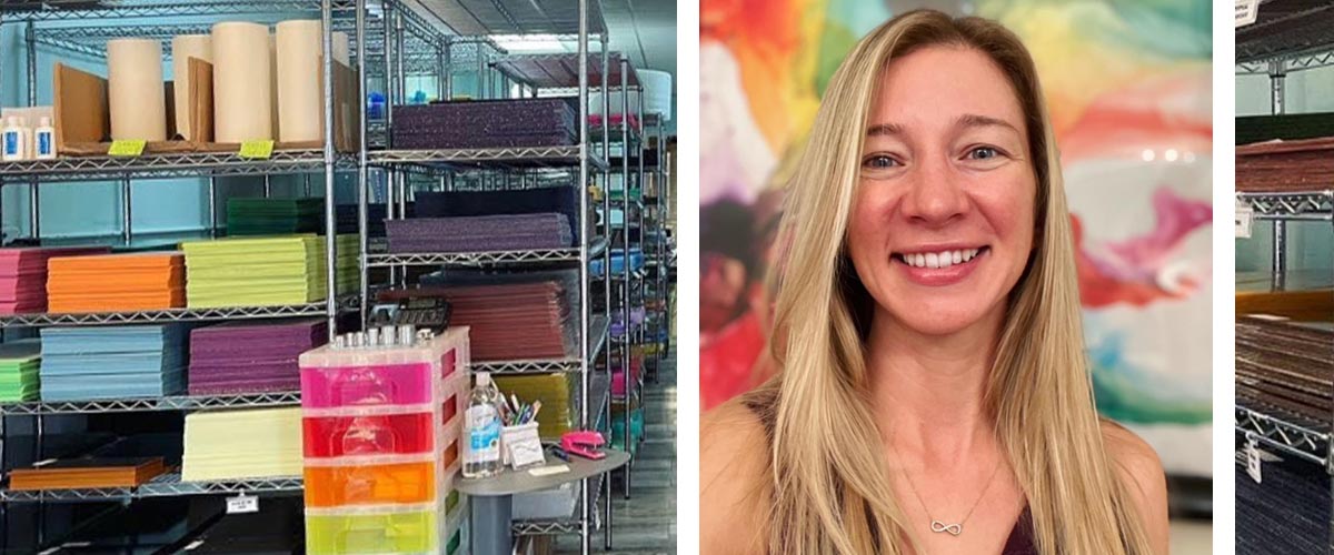 The Cerulean Tides warehouse with shelves stocked with colorful acrylic and a close-up of Amanda Leavitt.