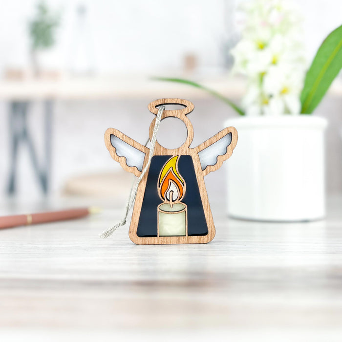 Celebrate a special moment with the Christmas candle ornament. This angel ornament, a beautiful memorial gift for Christmas, is perfect for anyone cherishing memories or celebrating milestones. Add it to your angel figurines collection, or gift it to enhance someone else's. Feature it prominently as freestanding Christmas angel decor — such as sitting it on a window sill or shelf. Alternatively, hang it as a Christmas tree ornament to enhance your holiday decor. Surprise someone with it as a Christmas ornament, and watch it brighten their space all year.