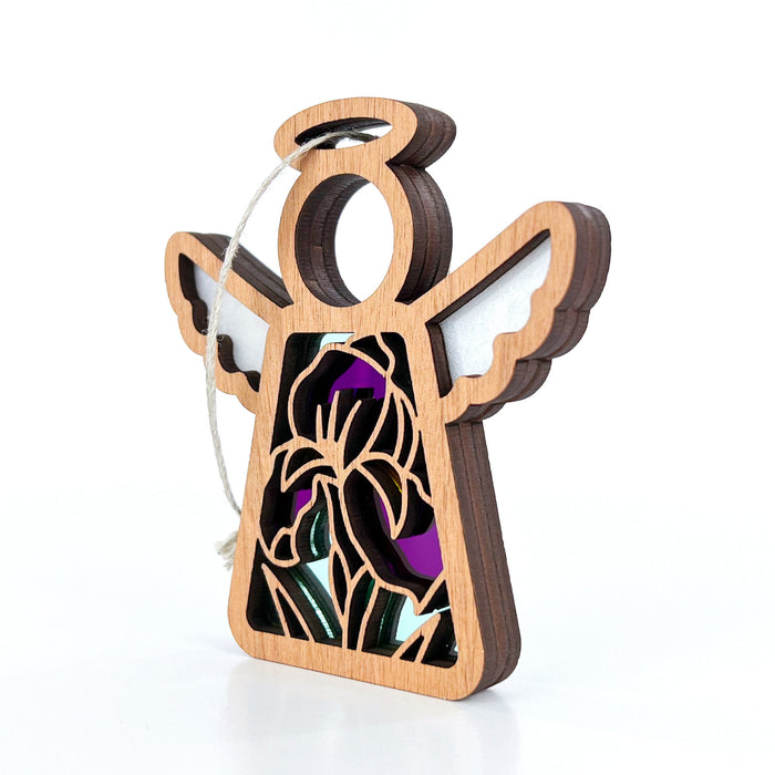Celebrate a special moment with the purple iris ornament. This angel ornament, a delightful flower gift, is perfect for anyone cherishing memories or celebrating milestones. Add it to your angel figurines collection, or gift it to enhance someone else's. Feature it prominently as freestanding flower decor — such as sitting it on a window sill or shelf. Alternatively, hang it as a Christmas tree ornament to enhance your holiday decor. Surprise someone with it as a Christmas ornament, and watch it brighten their space all year.